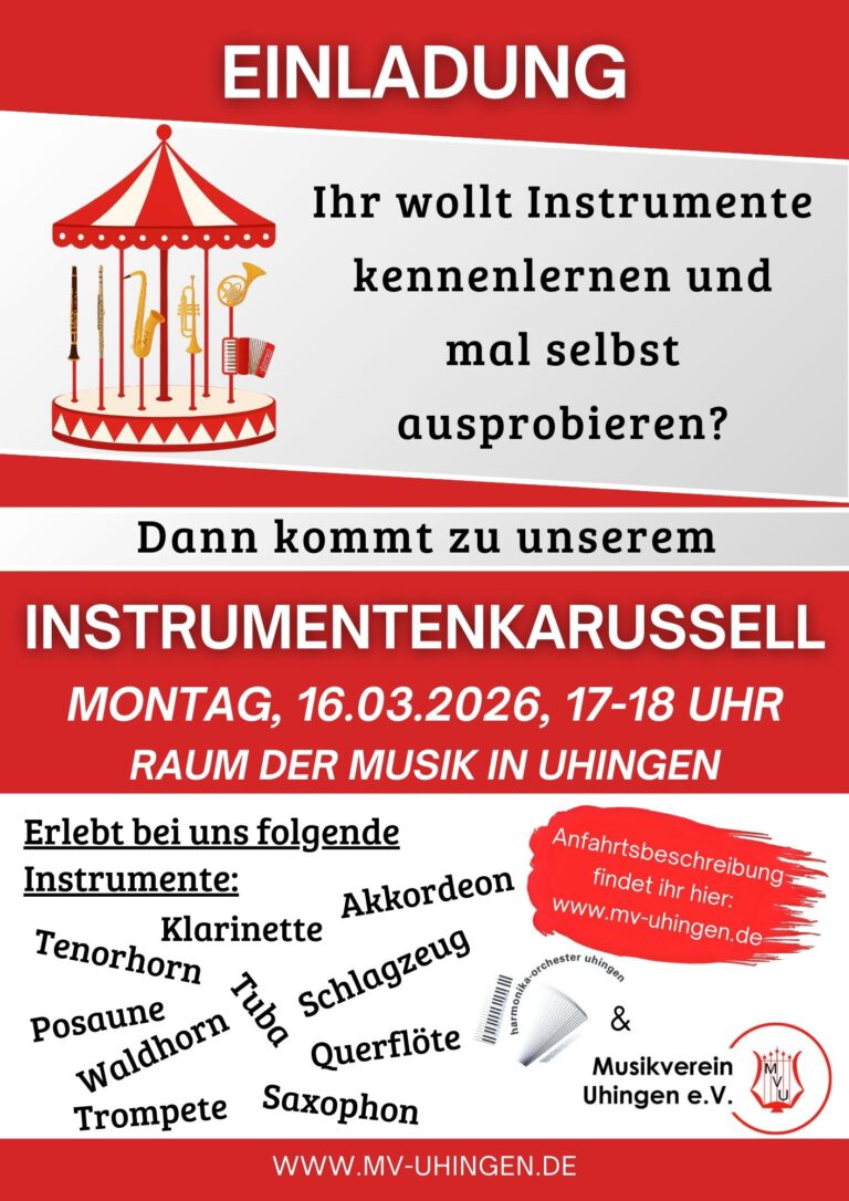 Am Montag, 16. März 2026 von 17-18 Uhr laden wir euch ein, verschiedene Blasinstrumente und Schlagzeug kennenzulernen. Unsere Freunde des Harmonika-Orchesters stellen dazu das Akkordeon vor. Es ist keine Voranmeldung erforderlich. Wo? Der Raum der Musik in Uhingen befindet sich hinter dem Hallenbad. Also müsst ihr an der langen Fensterfront entlanggehen und vor dem Wald…